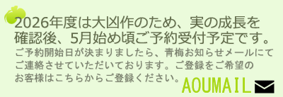 凶作とヒョウ被害のため、ホームページの内容を変更中です。準備が整いましたらご予約を開始させて頂きます。4月末には青梅お知らせメールとホームページにてご案内予定です。